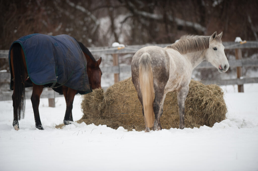 Hay, which contains a higher level of fiber than grains, provides more of a warming effect internally, because greater heat is released during the digestion of fiber than of starch from grain. Horses need at least 1 percent of their body weight per day in roughage (on a dry-matter basis) to maintain a healthy digestive tract, but 2 percent or more may be appropriate during cold weather, especially for horses who lives outdoor.
