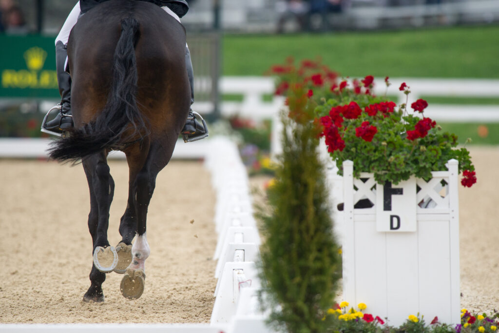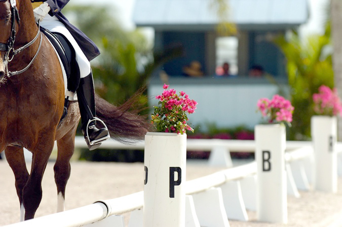 Another example: If you’re going across a diagonal, you need to come out of the corner and start to cross the diagonal at F and then hit the other end of that diagonal at H with your horse’s head, neck and shoulders. You can’t just whip through the corner and miss the letter completely. With this in mind, you also want to avoid going so far past the letter that you’re almost closer to P or B—whichever letter happens to be there—depending on the size of the arena you’re competing in.